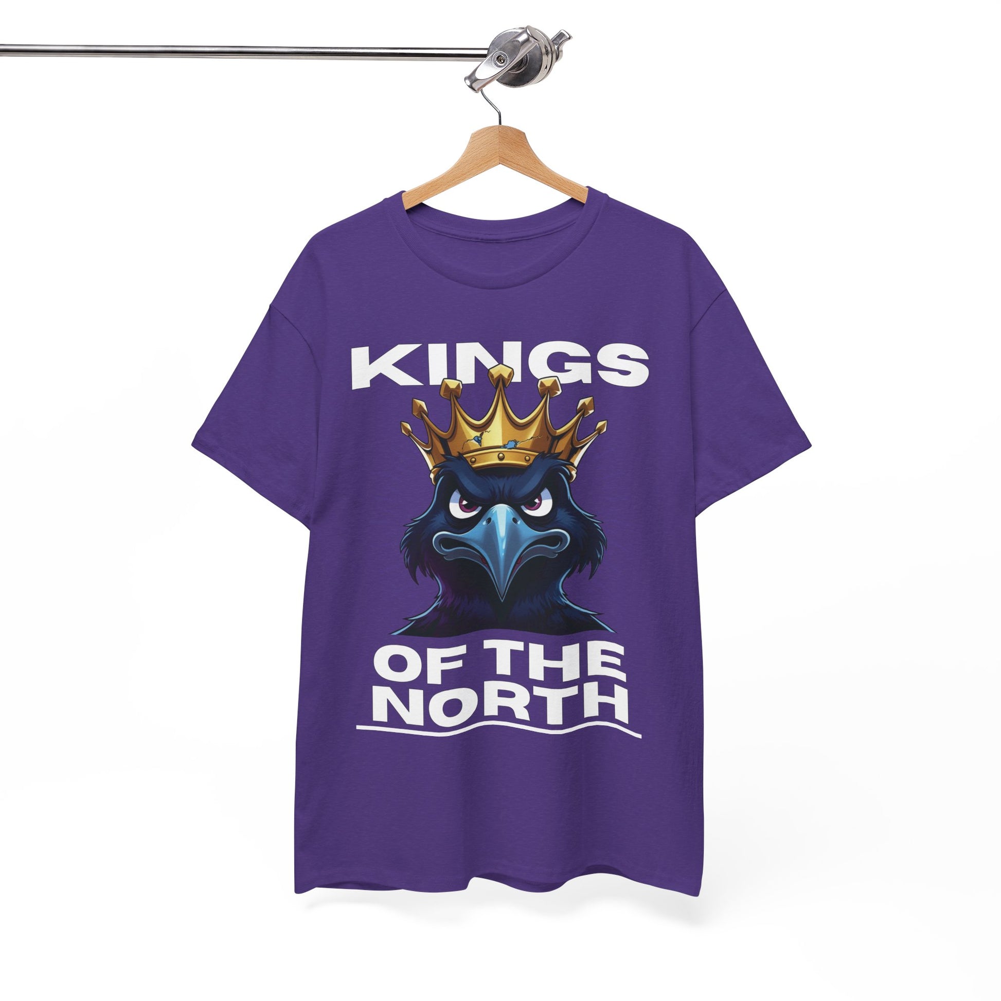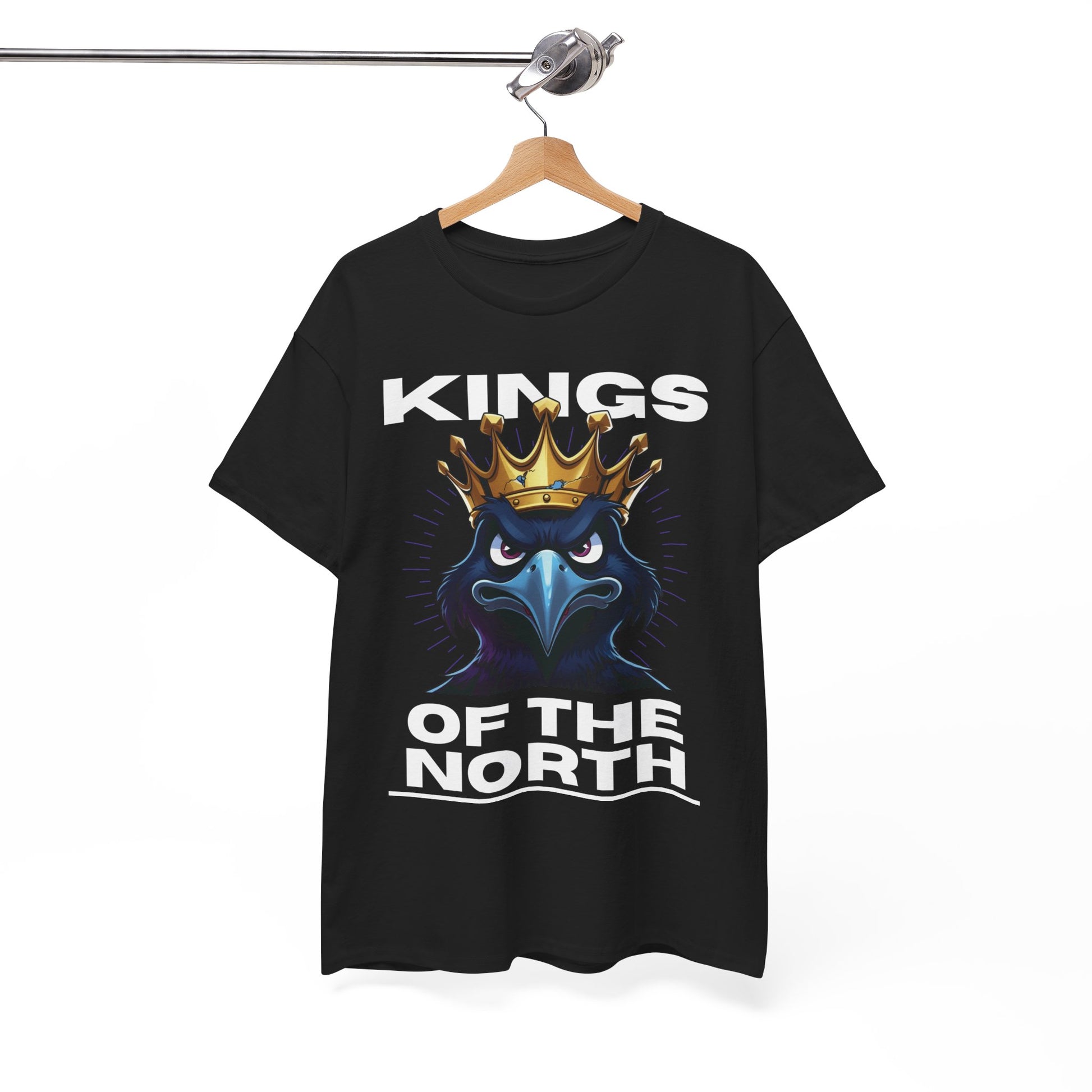 Above the raven, the text "KINGS" is displayed in bold, white, all-caps font, while below, the phrase "OF THE NORTH" is prominently featured in the same strong typeface. The contrast between the black background and the white text makes the design pop, ensuring high visibility.