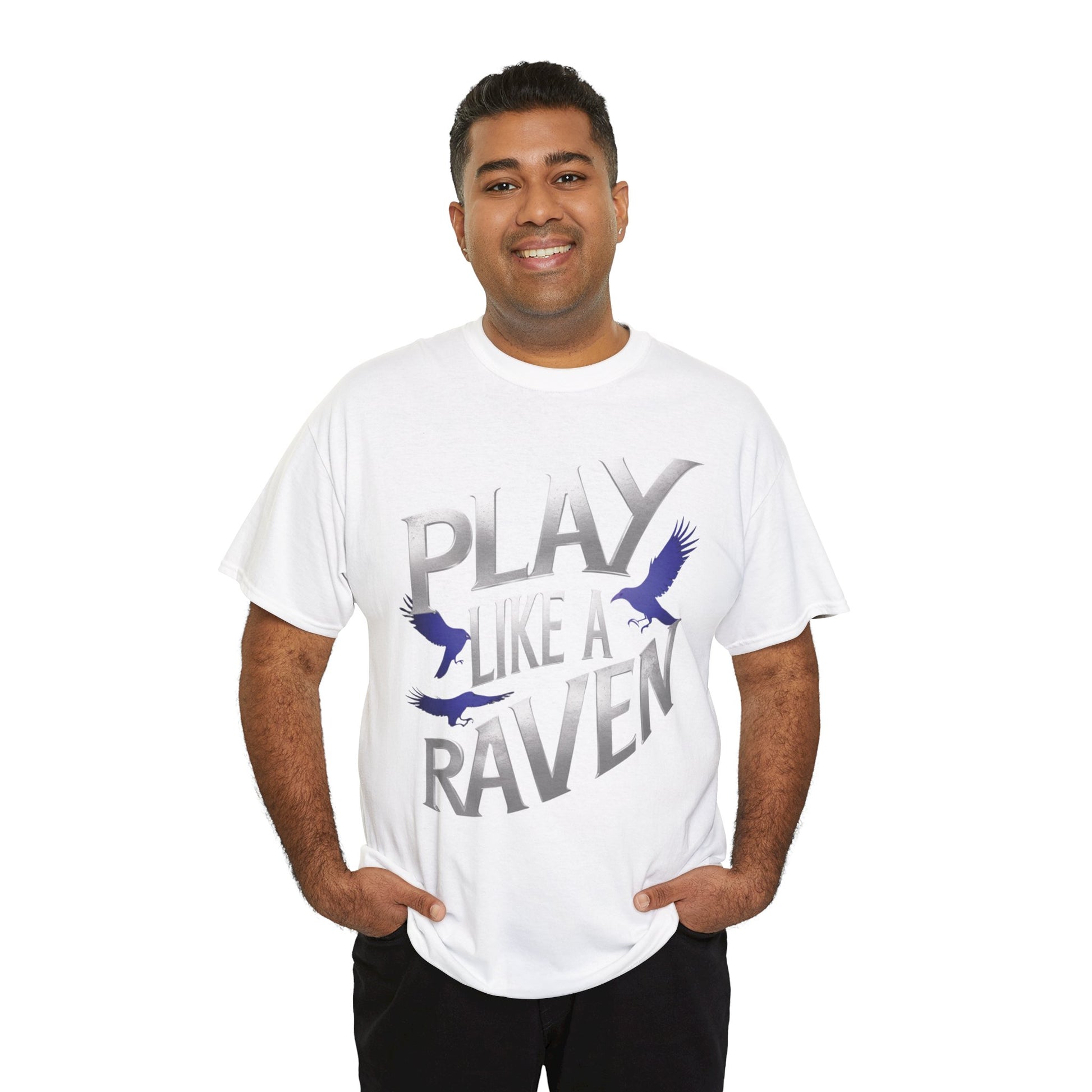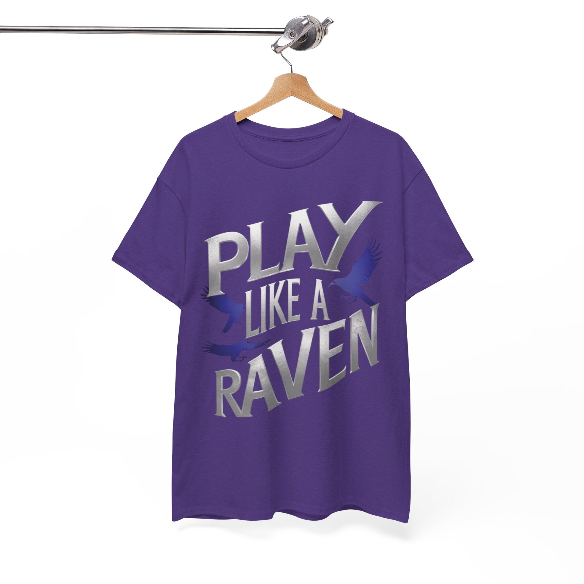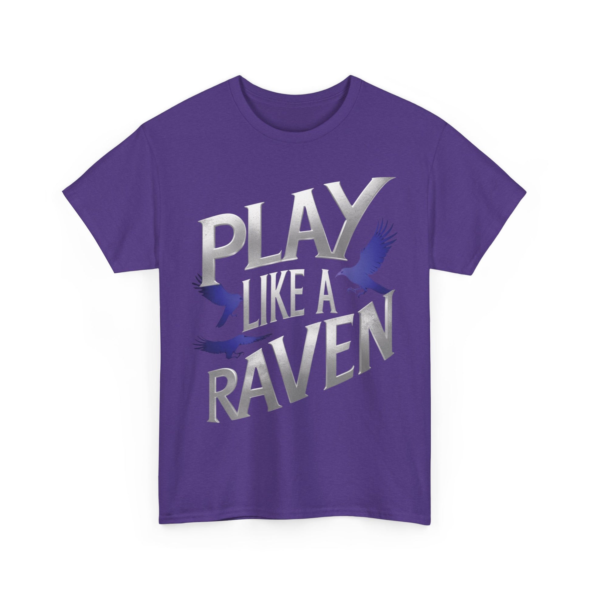 This T-shirt design features the phrase "PLAY LIKE A RAVEN" in bold, metallic silver text with a dynamic and sporty feel. The strong typography is paired with two vibrant purple ravens flying in the background, symbolizing agility, freedom, and strength. The contrast of the silver text against the black background enhances the design, making it eye-catching and powerful.